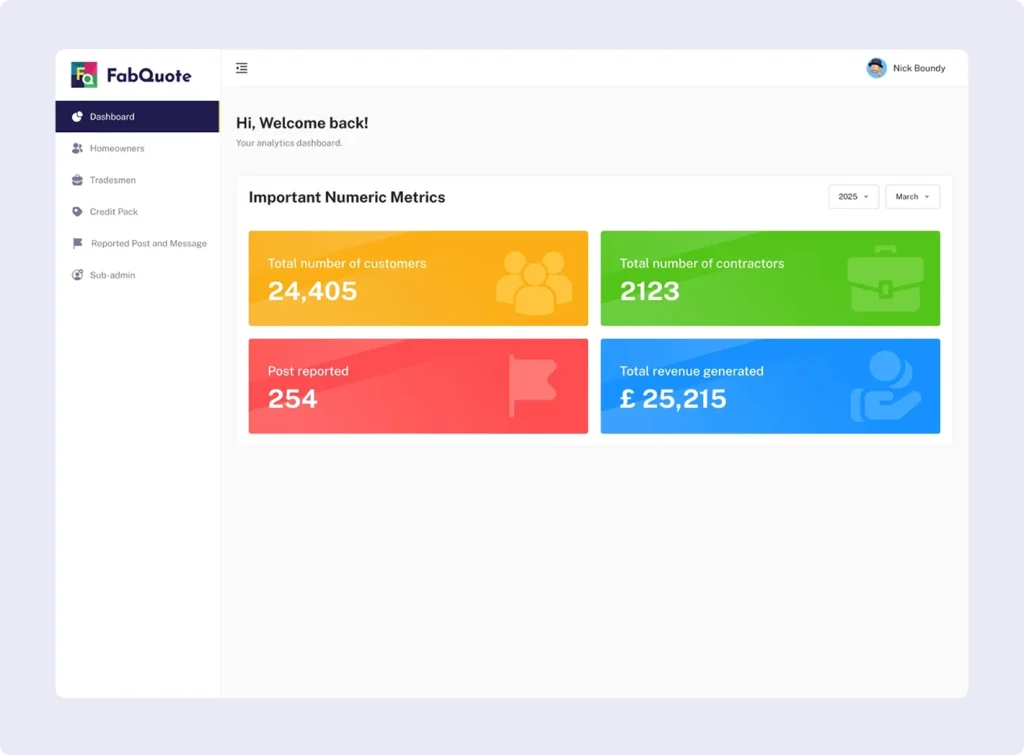 FabQuote’s admin panel provides full visibility and control over users, contractors, and jobs — helping you manage the platform with confidence and efficiency.